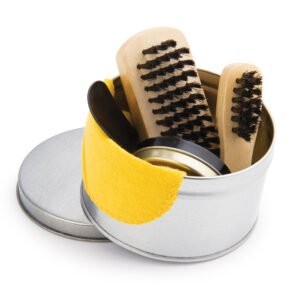 Set de limpieza para zapatos en caja metálica. Incluye: Paño, betún, 2 cepillos y calzador.