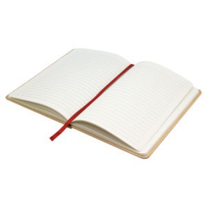21 x 14 cm (A5). Cartón y Papel. Libreta. Tapa en papel kraft. Interior 80 hojas rayadas en papel de 70 g. Cinta señaladora y cierre elástico del mismo color.