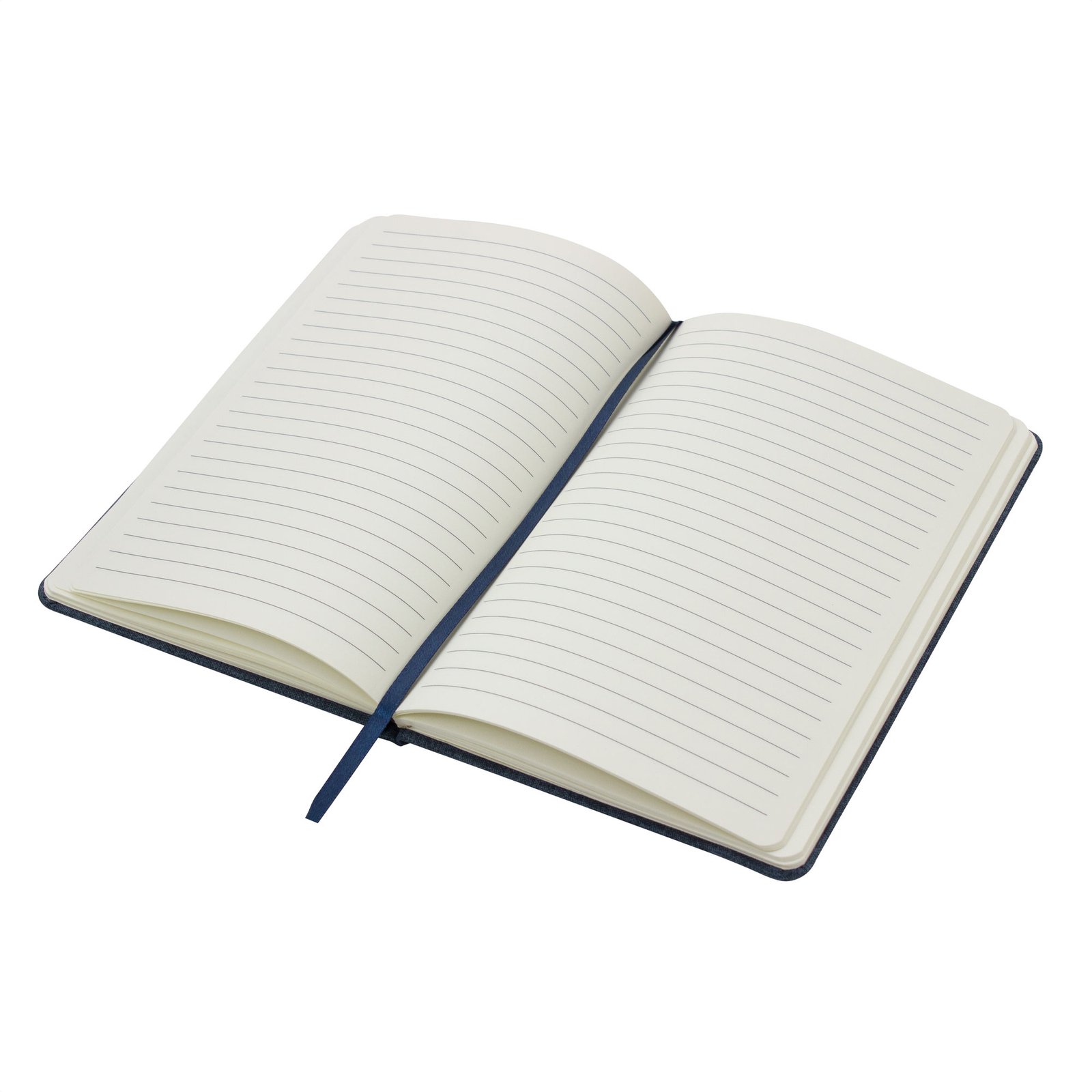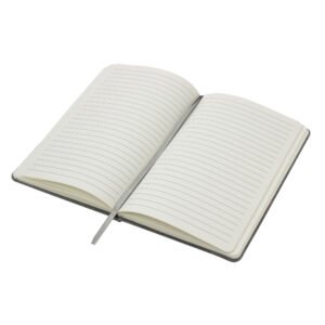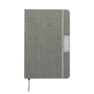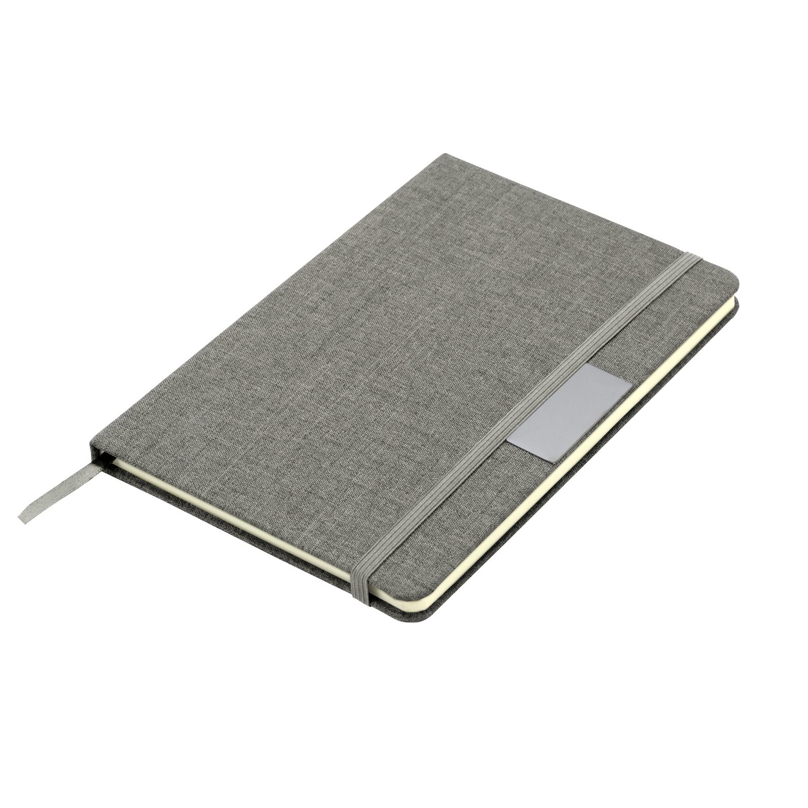 Libreta con placa metálica. Tapa de cartón de 300g recubierta en RPET 310. Placa metálica de 5 x 2 cm. Interior de 80 hojas rayadas en papel obra de 70g. Encuadernación cosida. Cierre con banda elástica del mismo color de la tapa.