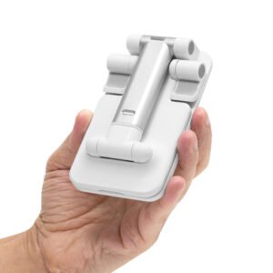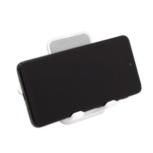 Soporte plegable para móvil. Tiene un sistema extensible de ajuste de altura e inclinación para posicionar el celular. Base con apliques de silicona antideslizantes.